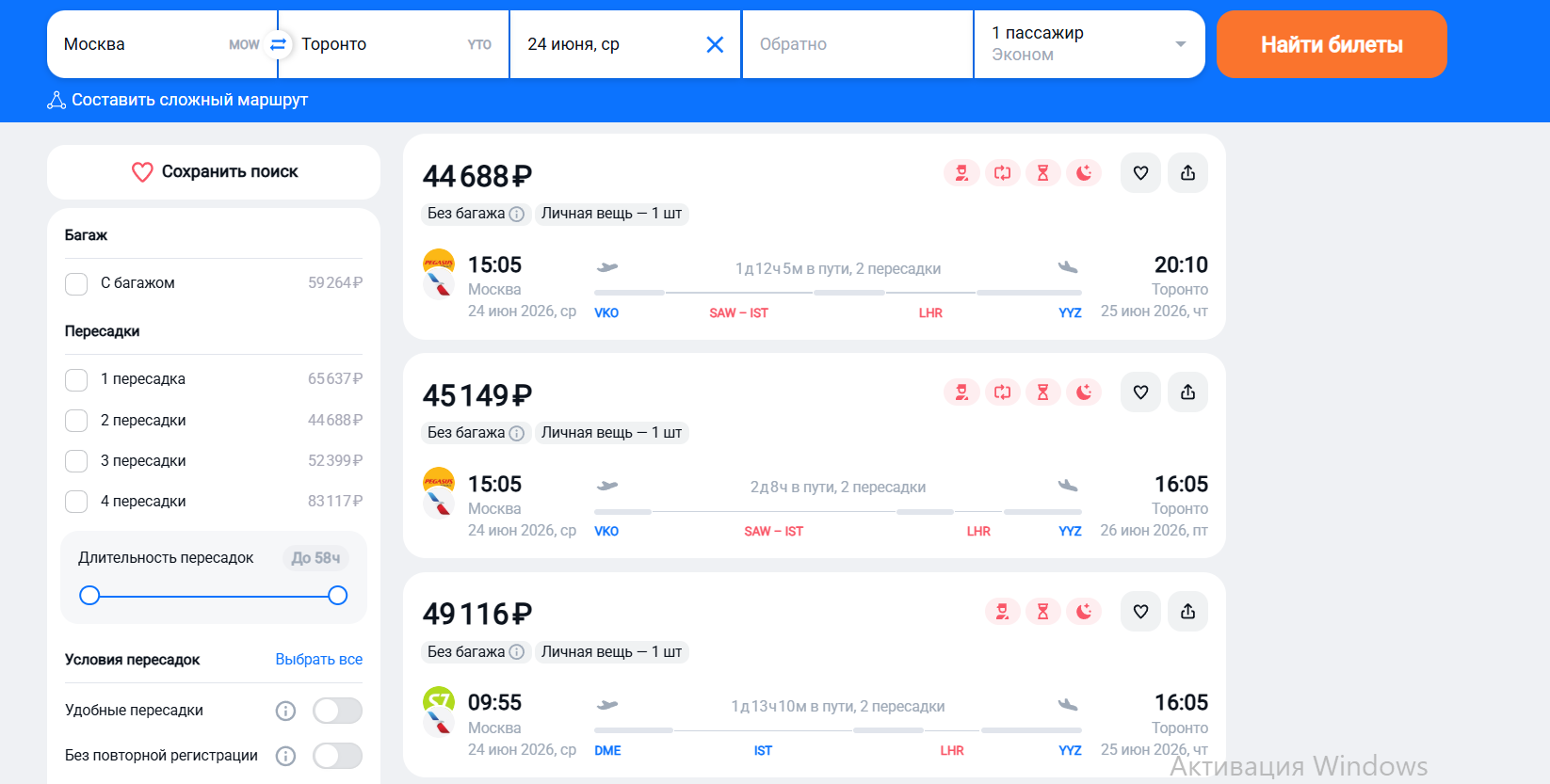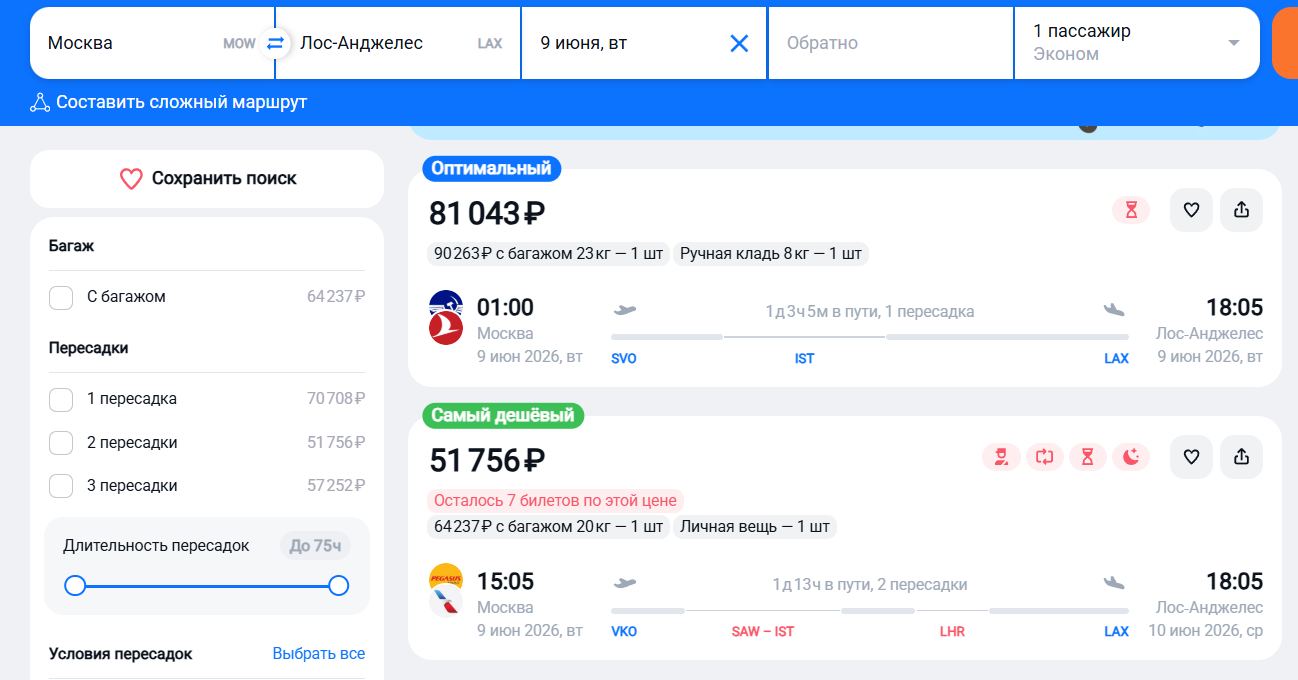 Стоимость билета на рейс из Москвы до Лос-Анджелеса в июне составит минимум 51 756 ₽ в одну сторону. До Торонто из столицы можно добраться с двумя пересадками за 45 149 ₽.