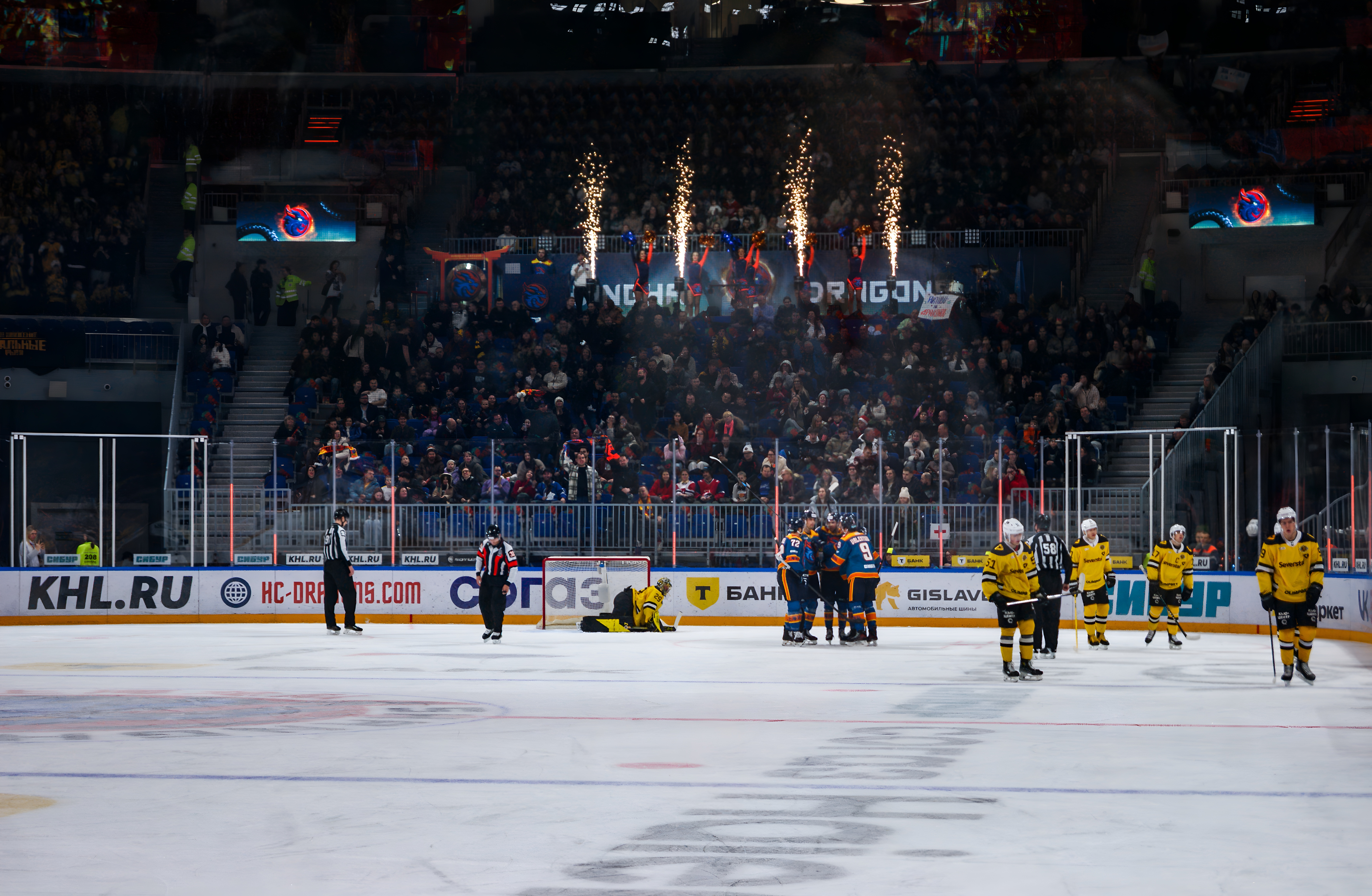 В паузах на арене звучат треки Nirvana, Xolidayboy, Жени Трофимова — публика разогревается не хуже, чем игра на льду. Вторая шайба влетает в ворота хозяев: Иван Подшивалов с передачи Давида Думбадзе переигрывает голкипера Кареева. Фанаты разворачивают флаги с надписью «Эра драконов», и поддержка срабатывает — 1:2.