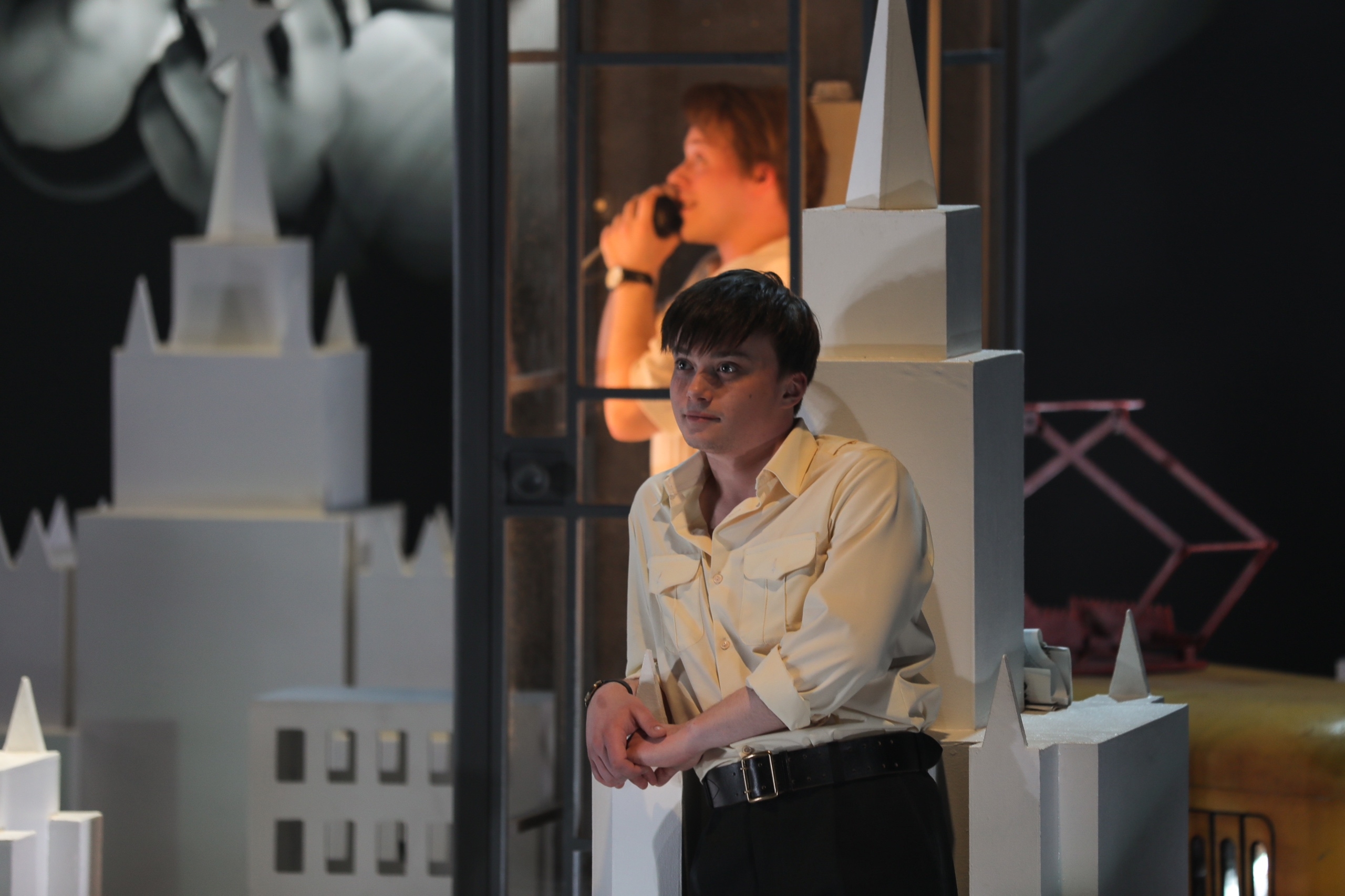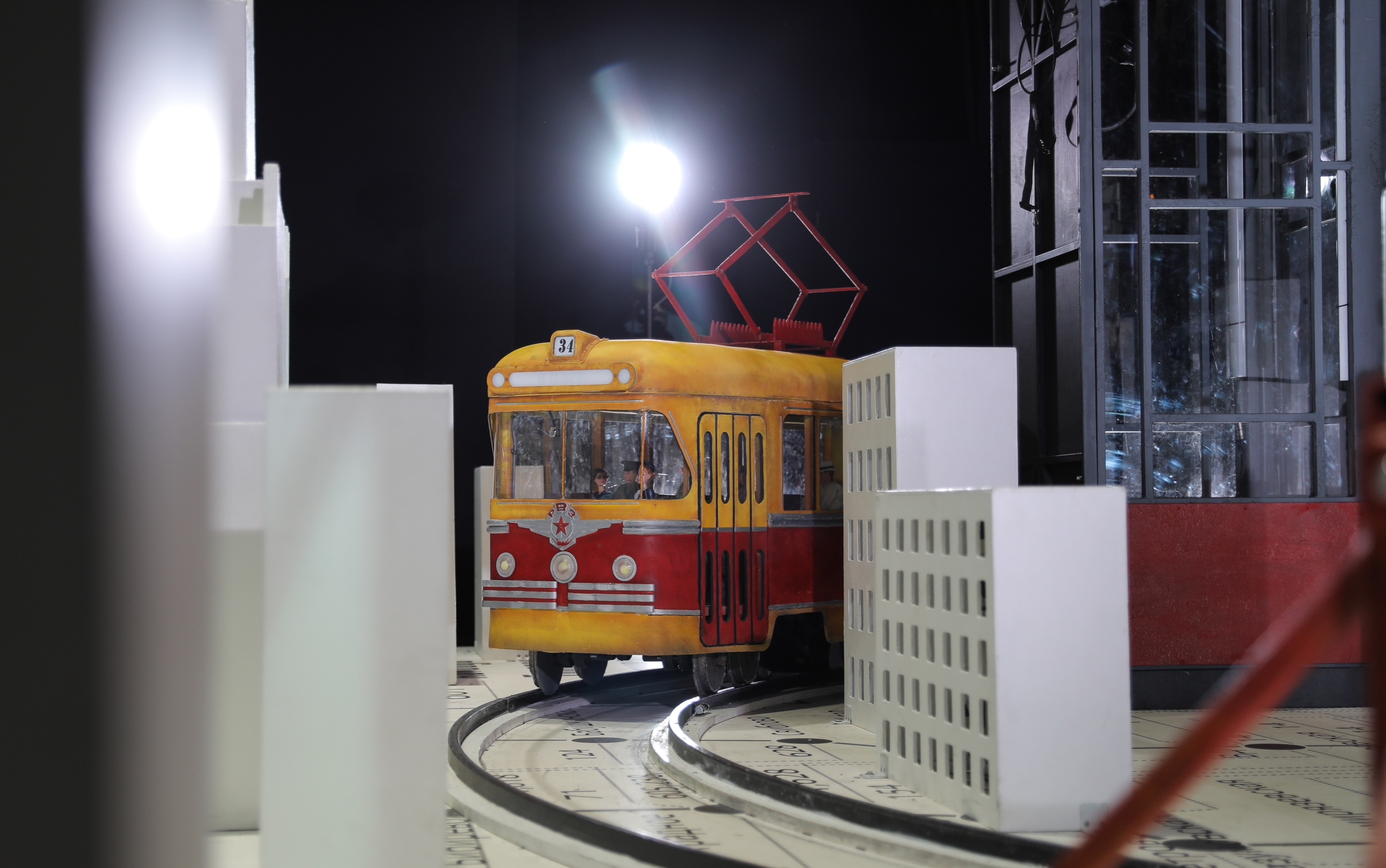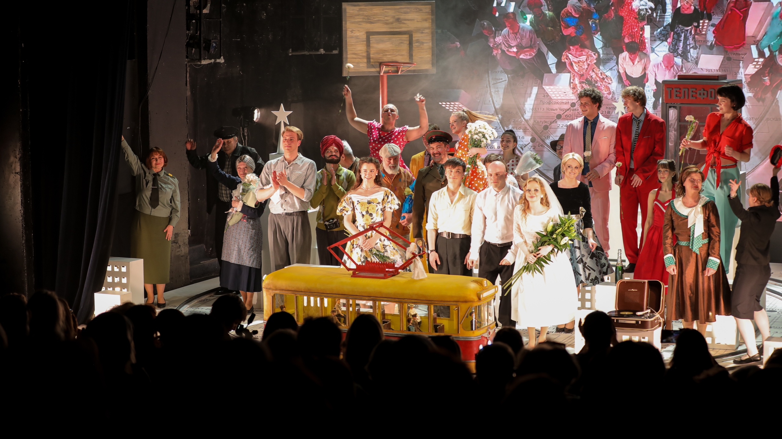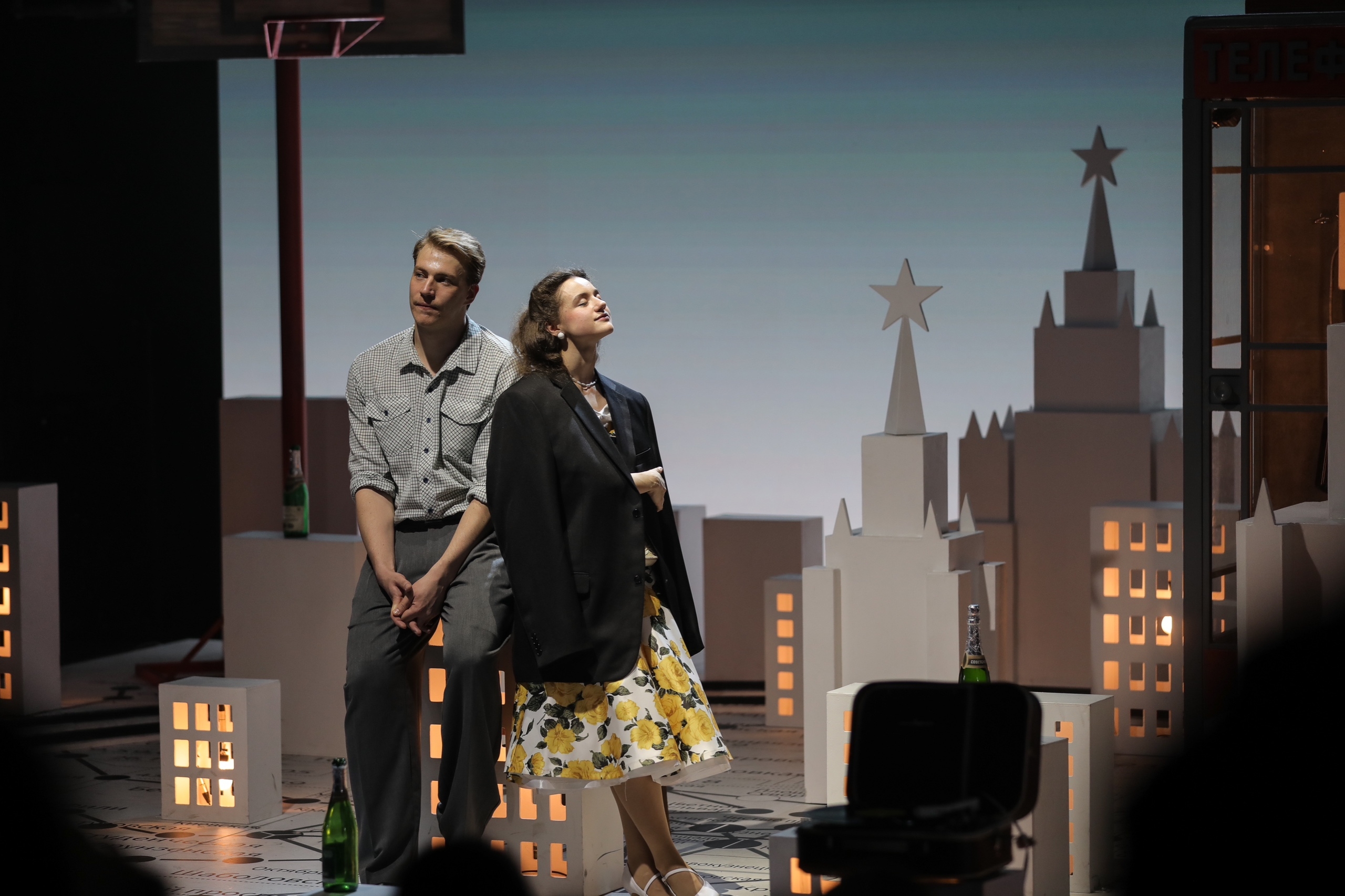 Московский пейзаж поддерживают лаконичные многоэтажки, где в каждом окне течёт неповторимая, уютная жизнь. На планшете сцены расчерчена схема метро, «обёрнутая» линией Садового кольца. По нему во время действия будет кружить почти игрушечный красно-жёлтый трамвайный вагон — такие вышли на рельсы как раз на пике «оттепели», в 1960 году. Лаконичным фоном служит экран, почти всё время лучистый, как рассвет. Но периодически на нём появляются медиапроекции — самолёт, который становится одним из лейтмотивов спектакля, и крупные планы актёров.